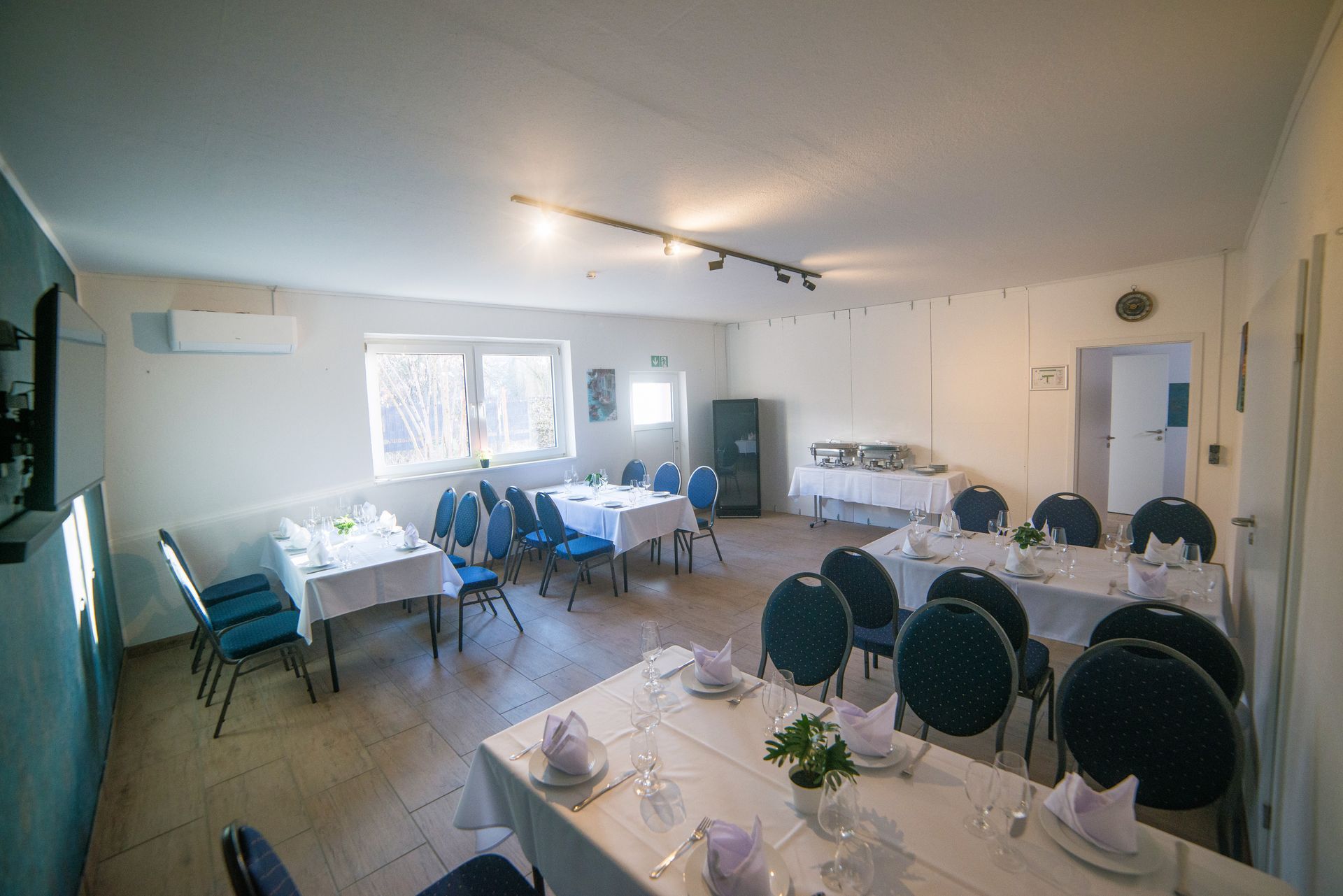 Unsere 4 individuellen Räume können einzeln oder in Kombination gebucht werden werden, sind komplett mit Tischen, Stühlen, Multimedia (Smart TV, Soundbar) und einem Gastrokühlschrank ausgestattet. Sie können Ihre eigenen Bilder, Videos und Musik abspielen und sind nicht an ein bestimmtes Catering gebunden - bringen Sie einfach alles selbst mit, wenn Sie möchten.